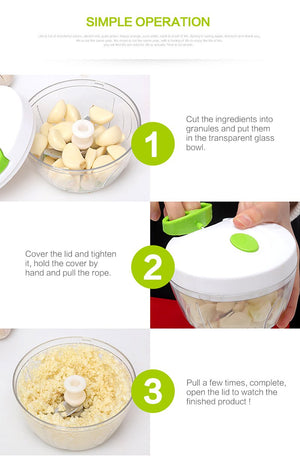 The All in One Chopper is a manually-powered multi-purpose food chopper made from Eco-friendly and non-toxic ABS and stainless steel materials. It features sharp stainless steel blades for fast and even chopping/mincing, a comfortable soft grip lid, anti-skid base, easy pull cord, and a large handle.