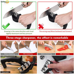 • (2) DESIGNED FOR SAFETY: For safety this is your first choice! The special design protects you when using knife sharpener. The ergonomic plastics handle comes with non-slip rubber base maximizing stability making sharpening easy & minimizing risk of injuries. Non-slip rubber base firmly attached to the surface of desktop and hold the sharpener in place, makes you avoid being cut.